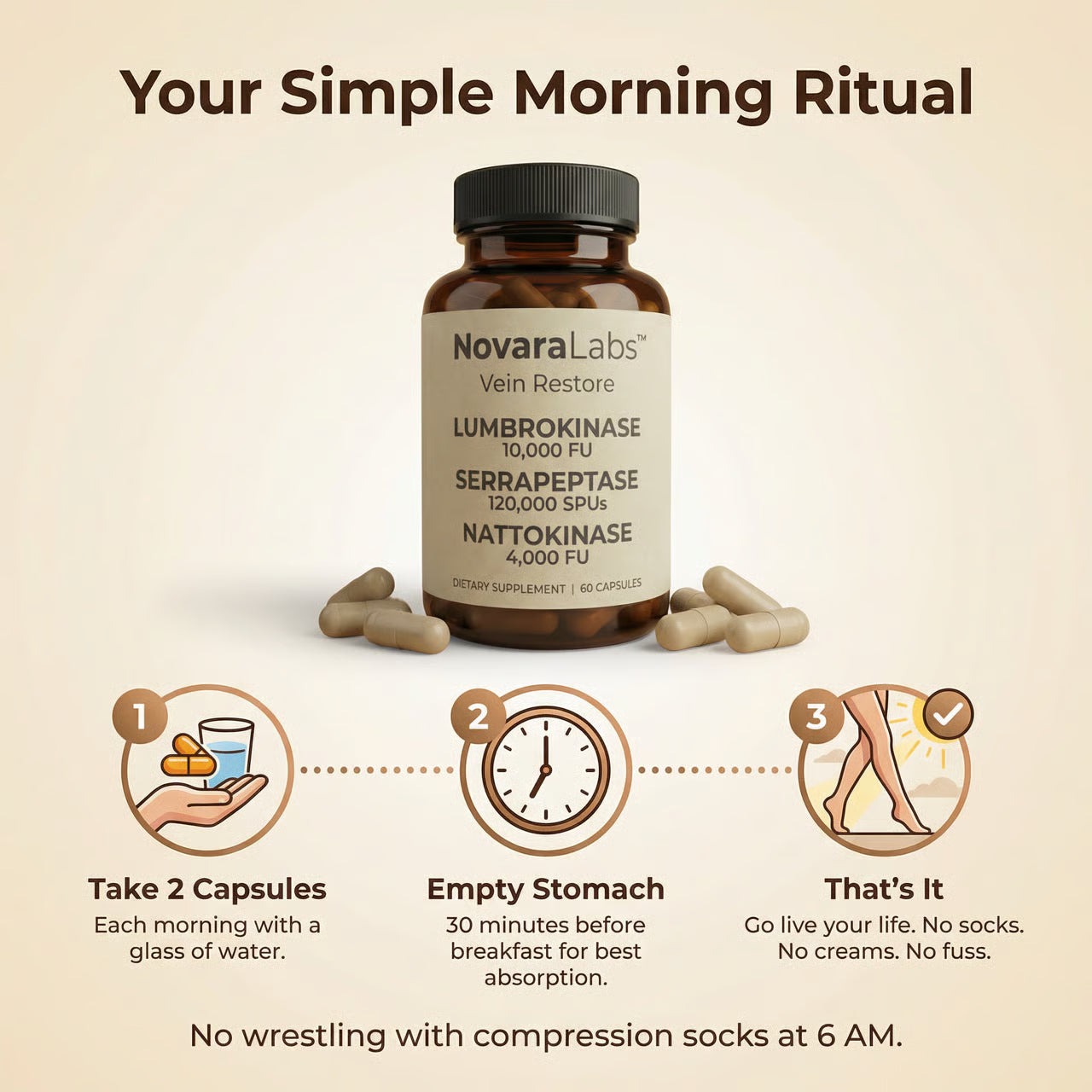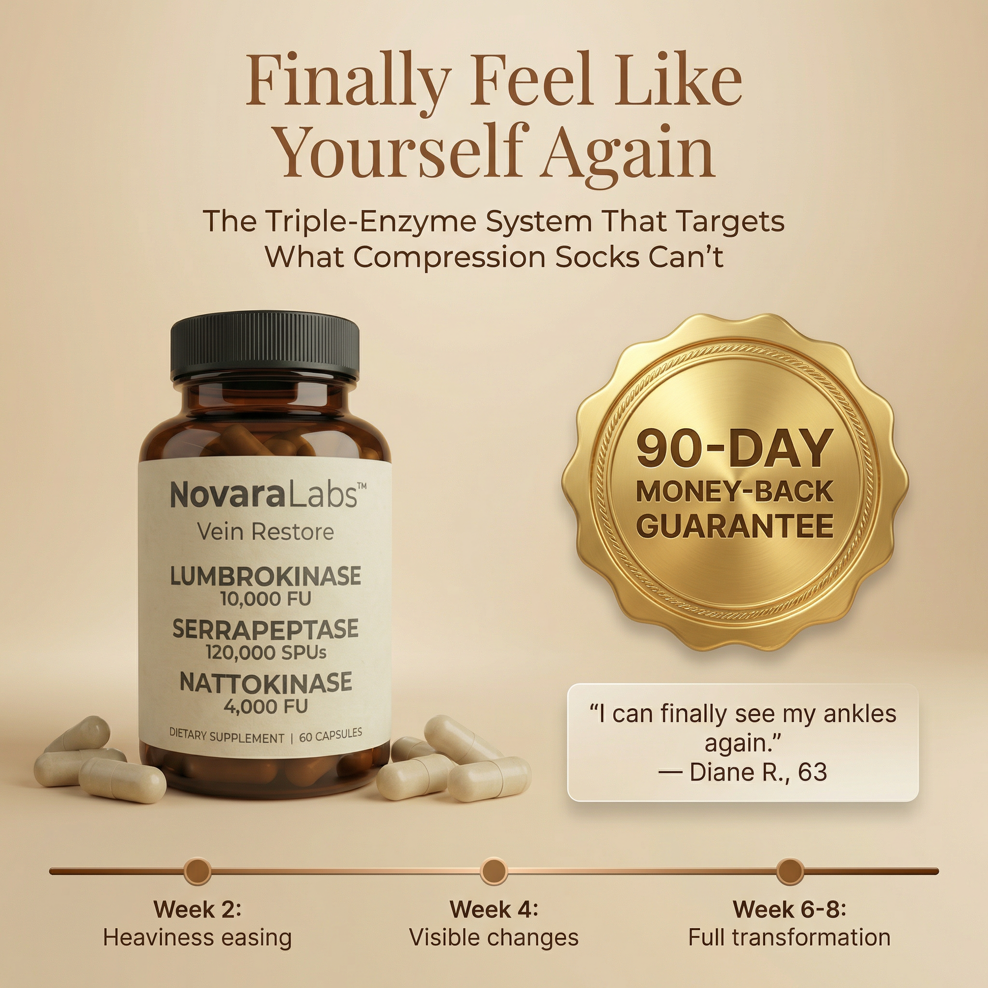 What It Is: Vein Restore is a daily enzyme supplement designed for women experiencing chronic leg heaviness, swelling, and visible veins. Unlike compression socks that squeeze from the outside or creams that sit on the surface, Vein Restore works from within—targeting the microscopic protein buildup (fibrin) that forms around your blood vessels over time.